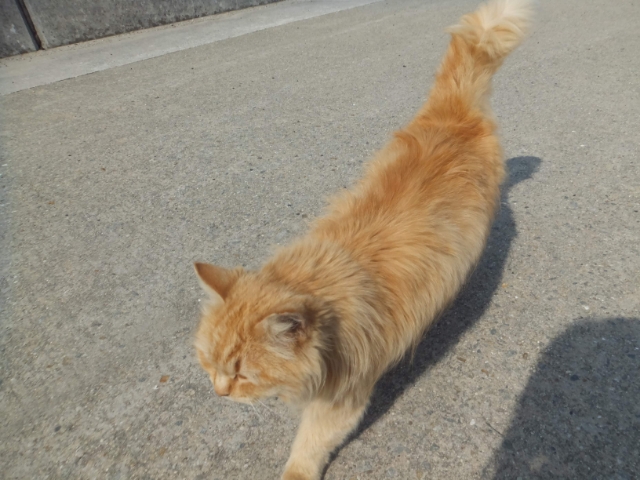 このネコ、ずっとついてきます!たまに私を追い越して先へ行くのですが、すぐ先で待っててくれます。なんだか相棒が出来たみたいでうれしい。もうこの子連れて帰ろうかな。