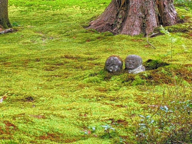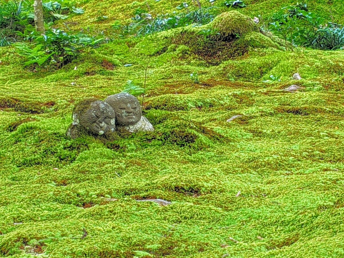 頬杖をついてコケの絨毯に寝転がっているお地蔵様。寝姿のお地蔵様って初めて見たのですが、とってもキュートですね!
