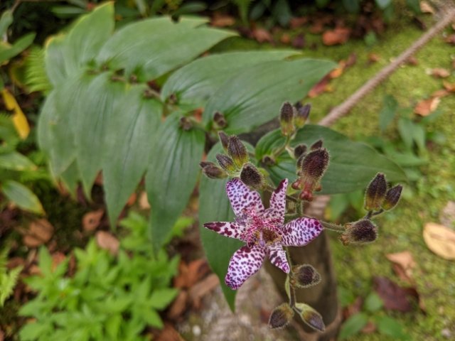 ちょっとだけ毒々しい色合いのホトトギス。ホトトギスときくと「テッペンカケタカ」の鳴き声でお馴染みの鳥が有名ですが、植物にも同名の種が存在しています。花びらの斑点が鳥のホトトギスの胸の模様と似ているため、この名が付いたと言われています。
