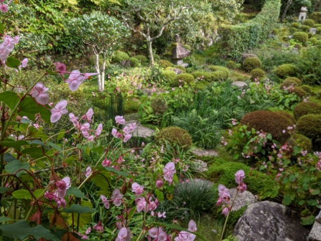 岩や築山を包み込む緑がとっても美しい。9月はハギやシュウカイドウがピンク色の花を咲かせて華やかに彩ります。