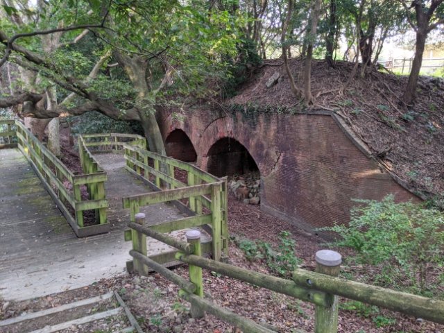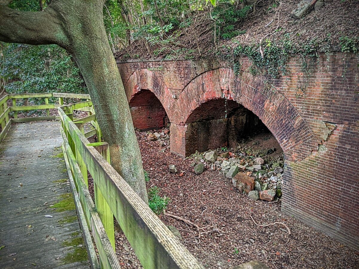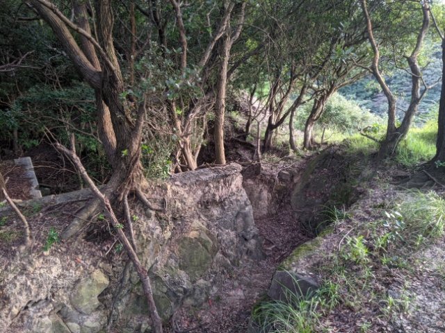石とコンクリートで造られた第五砲台跡。ここも第三砲台跡と同様に加農砲が設置されており、駆逐艦などの小型艦艇攻撃を想定していたそうです。規模は小さいですが、比較的ひらけた場所にあり、フェンスも無いためかなり近くで見ることができます。