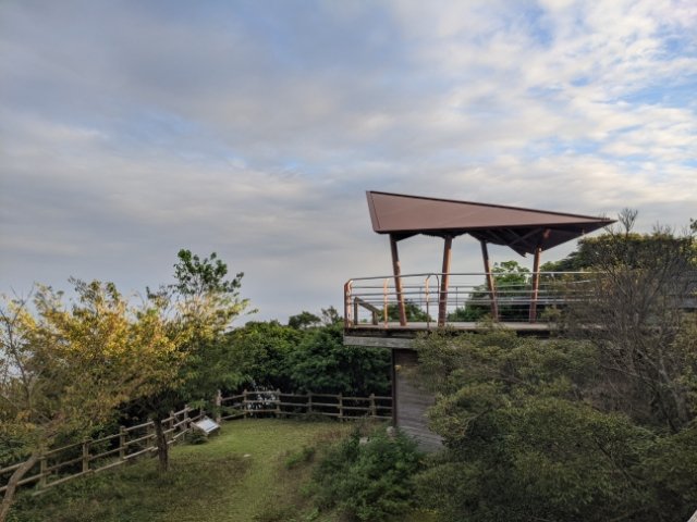 おしゃれなテラス風の展望台。高台の開けた場所にあるため、吹き抜ける海風がとっても心地良い。散策路の半ばにあるため、ひと休みポイントとしても良さそう。