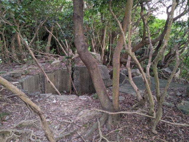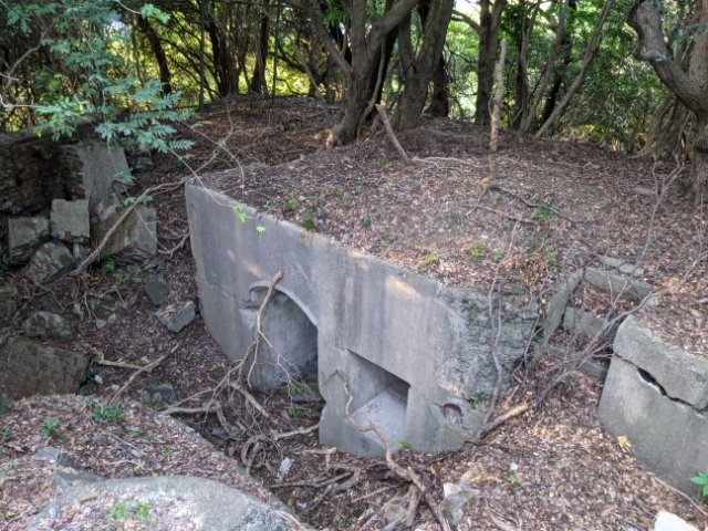 こちらのコンクリートでできた遺構は観測所跡。前述の通り、榴弾砲は山なりに打ち上げるため、目視で狙いを定めるのは困難。敵艦までの方向と距離を測るためにこちらの観測所が置かれていました(たぶん)。潮の満ち引きなども計算して狙いを定め、座標位置に敵艦が来たら発射していたそうです。
