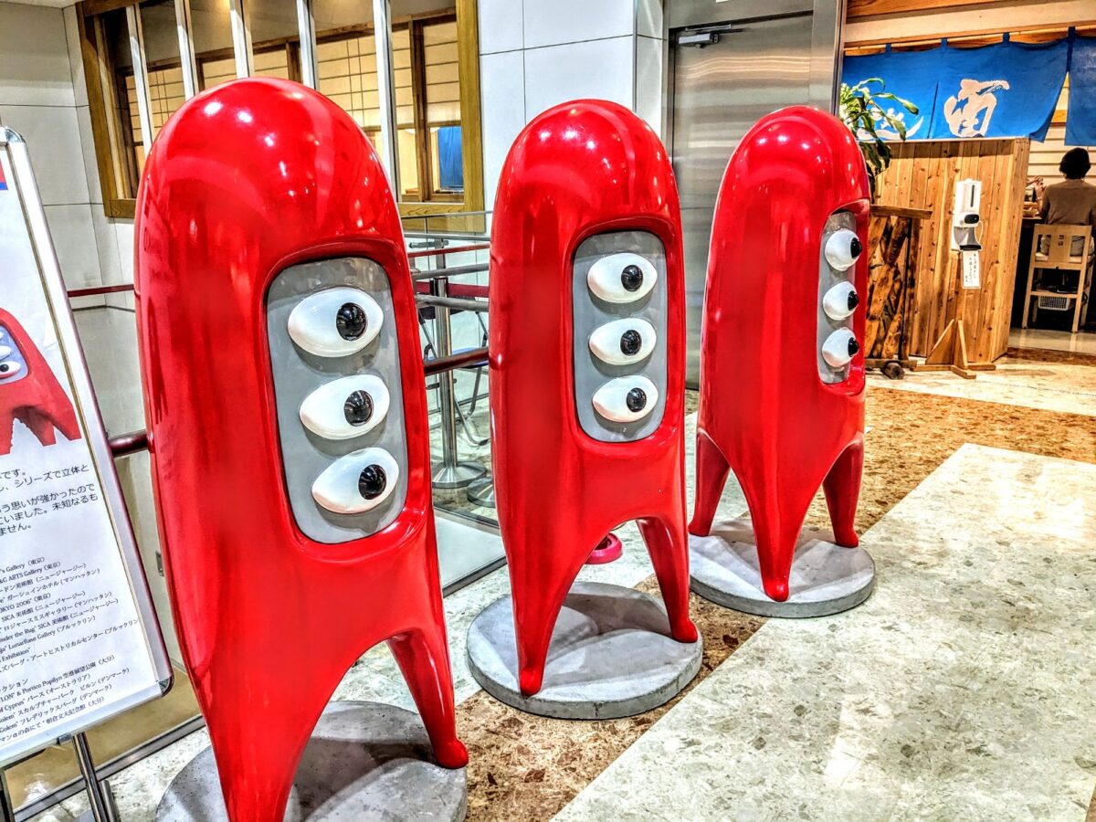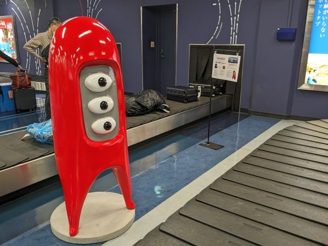 手荷物受取所のコンベアには赤い宇宙人が集まっています。こちらは「パジャマジャ星」に住む「ポルチコポピリン」という宇宙人。SAVAKOさんというアーティストによる作品であるそう。