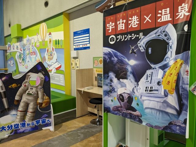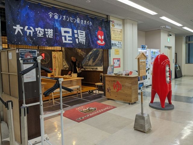 「おんせん県」ならではのスポットといえば1階到着ロビーにある足湯。屋内型ですが、無料で利用可能です。なぜか宇宙仕様になっていますが、その理由はこの後。