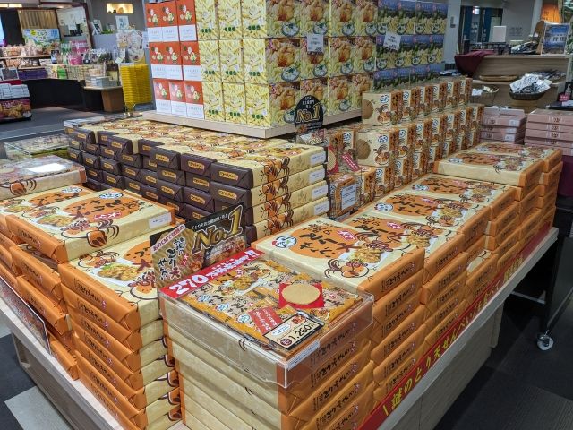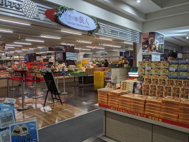 2階の保安検査場の前に広がるのが、ほぼ唯一のお土産屋さん「空の駅旅人」。最後のお買い物タイム、ということで定番の大分みやげを色々と買ってみました!