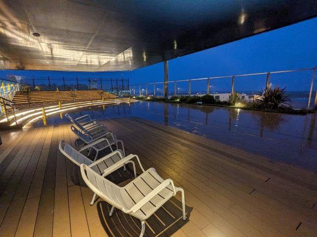 空港恒例の展望デッキ。小さな空港なのでそれほど期待していなかったのですが、ライトアップがとってもおしゃれな雰囲気。気づいたらもう外は真っ暗ですね。