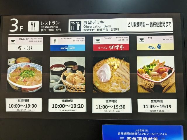 ここ最近は、空港で夕食を食べて旅の最後をしめくくるのが楽しみのひとつ。大分空港には「ビューレストラン スカイライン」「和風レストラン なゝ瀬」「すし処 宙(そら)」「味噌亭」「sky cafe azul」という、5軒の飲食店が入っています。