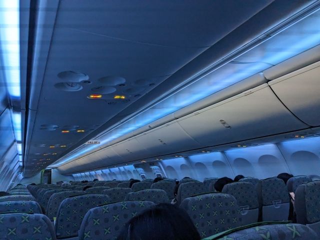 夜間のフライトのため、機内の照明は薄いブルー。いつも思うのですが、この色合いすごくキレイですよね。
