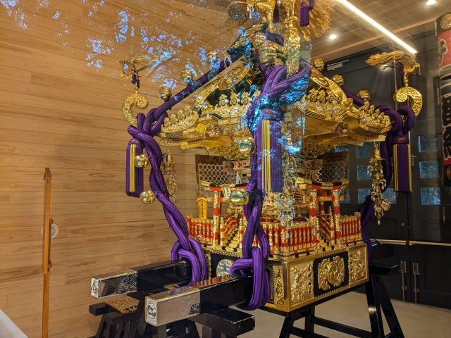 神輿蔵はガラス張りで常時見学可能。中を覗いてみると、キラキラ輝く絢爛なお神輿が!!