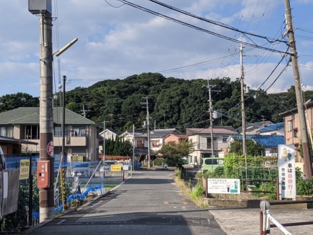 しばらくは住宅街を進みます。家々の奥に見えている山が応神天皇陵古墳。言われないと古墳とは気が付かないのではないでしょうか。