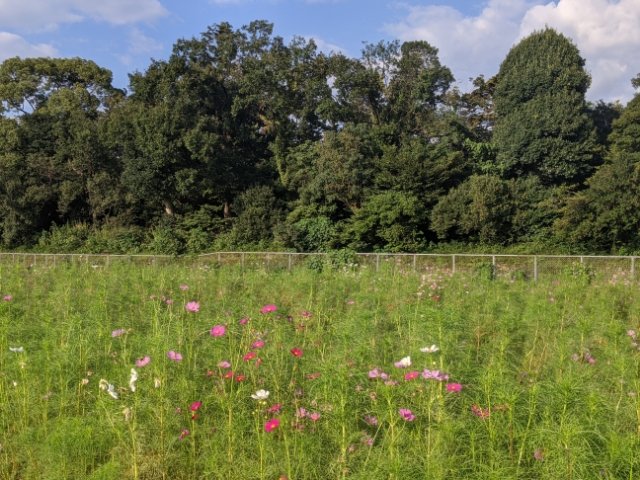 コスモス畑と応神天皇陵のコラボレーションは、秋ならではの光景です。