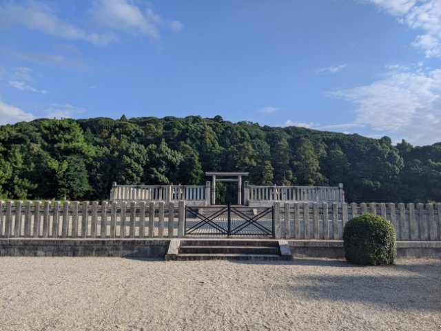 各地の天皇陵と同じく、鳥居と玉垣に包まれた拝礼所。その向こうには木々に包まれた墳丘が、まるで山のように広がっています。訪れている人の姿は無く、凛とした空気。