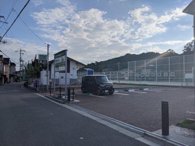 周辺は完全に住宅街、特に観光スポットなども無いため、コインパーキングすら設置されていないようです。古市駅前にはあるようですが、そこから拝礼所までは約2km。歩けない距離ではありませんが、旅中での訪問だったので片道30分かかるとスケジュールが圧迫されます。