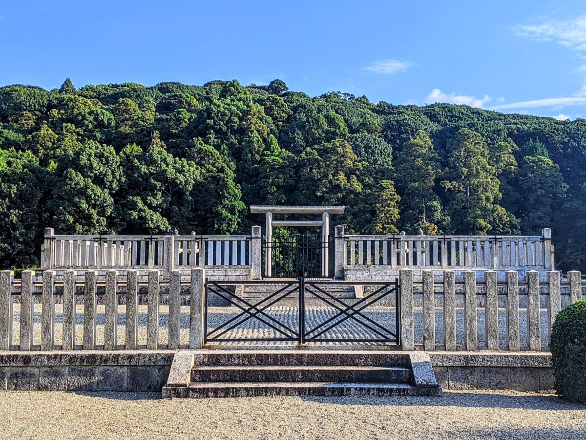 各地の天皇陵と同じく、鳥居と玉垣に包まれた拝礼所。その向こうには木々に包まれた墳丘が、まるで山のように広がっています。訪れている人の姿は無く、凛とした空気。