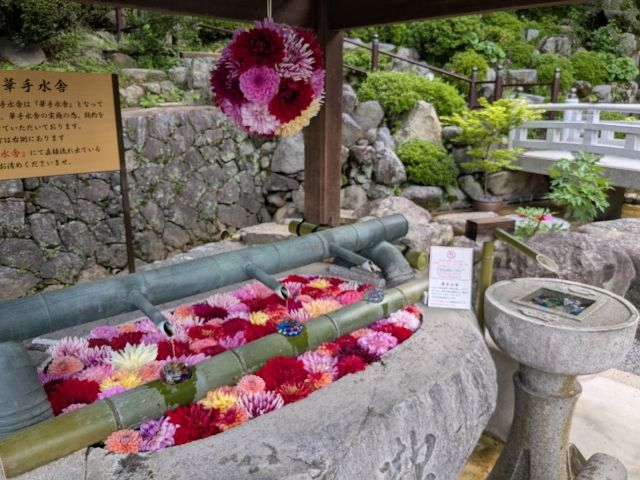 手水は色鮮やかな花手水に。カラフルな花で彩られた姿は、思わず写真に撮りたくなります。