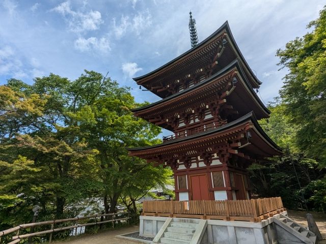 高くそびえ立つのは、高さは15.4mの三重塔。塔身に比べて屋根が大きくせり出しており、細さを際立たせます。