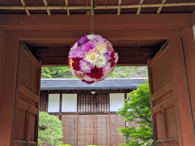 楼門にはボタンの花で作られた華宝珠も吊るされています。使用されているのは、天竺牡丹という種類であるそう。