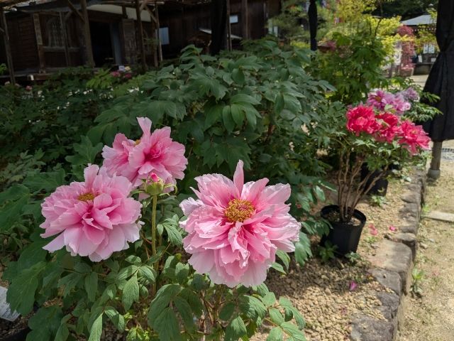 春のシャクナゲや秋の紅葉など、季節に合わせた見どころもあります。5月に訪問したところ、境内では多数のボタンが花を咲かせていました。