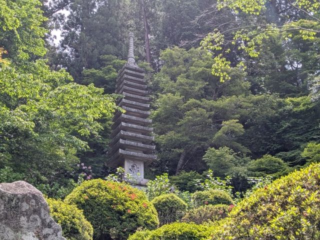 本堂の奥は木々に包まれた道が続き、奥之院へと繋がります。高くそびえ立つ十三重石塔の傍を進んで行きます。
