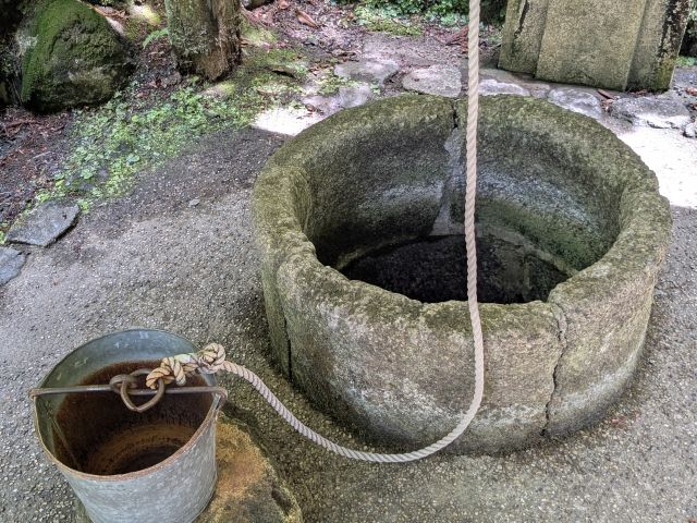 こちらは瑠璃井。今も水が湧いており、「厄除けの水」として参拝者が汲むことができます(飲用不可)。釣瓶を落とし水をくみ上げることができますが、これめっちゃ労力が要りますね!蛇口ひねれば水が出る現代からはそうぞ