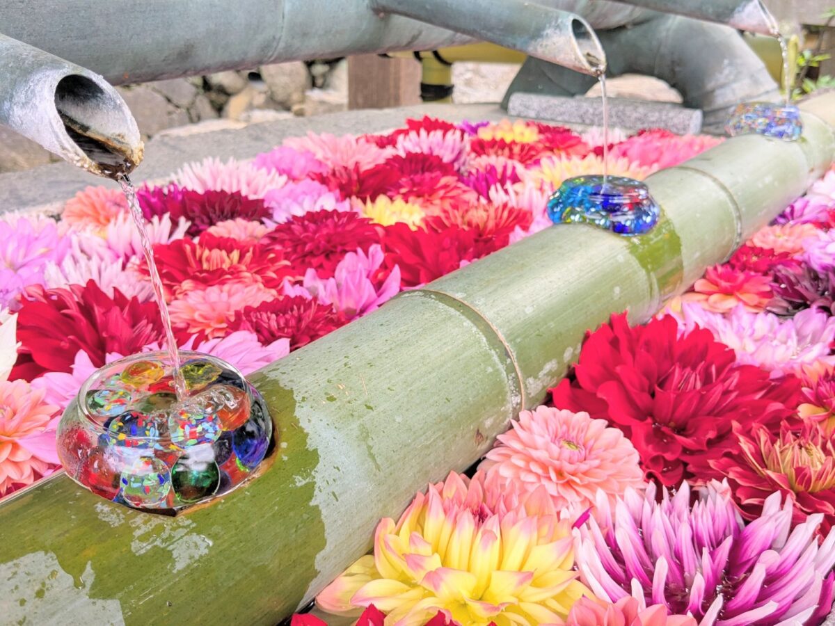 手水は色鮮やかな花手水に。カラフルな花で彩られた姿は、思わず写真に撮りたくなります。