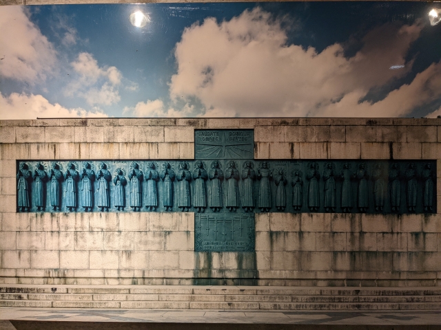 途中、階段を蛇行するように道が続いています。この道沿いにはキリストの受難を記した石碑が並んでおります。こちらは戦後の日本を代表する彫刻家・舟越保武氏による「十字架の道行」。