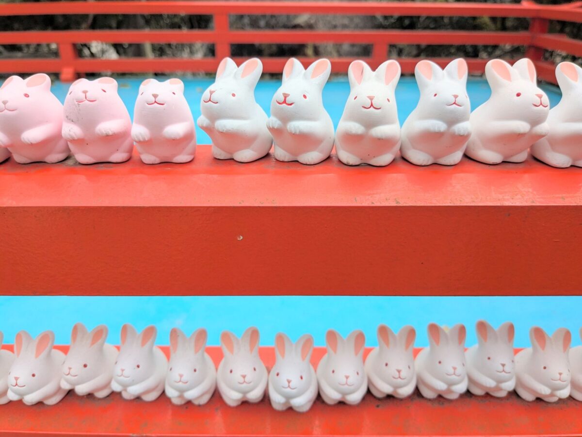 おみくじももちろんウサギ。中におみくじが入っているのですが、持ち帰らずに並べて帰る参拝者も多いそう。白とピンクのウサギがずらりと並ぶ姿はとっても愛くるしいです。