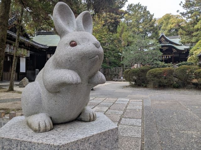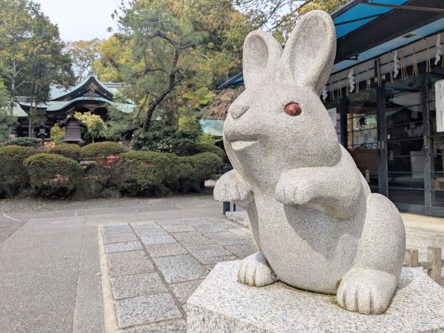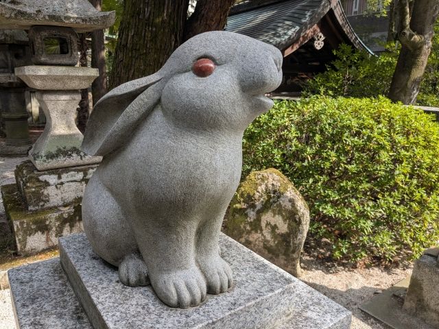 さてさて、岡崎神社といえばウサギ!鳥居の先には、狛犬ならぬ狛うさぎが構えています。狛犬には魔除けや神前守護といった意味がありますが、ウサギさんはかわいさ100%!