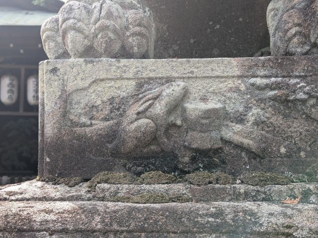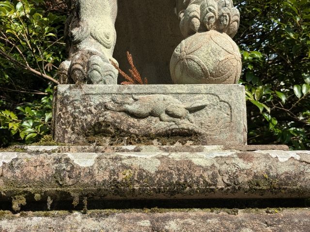 これは狛ウサギではなく、「狛犬」の台座部分。餅つきする姿が描かれています。