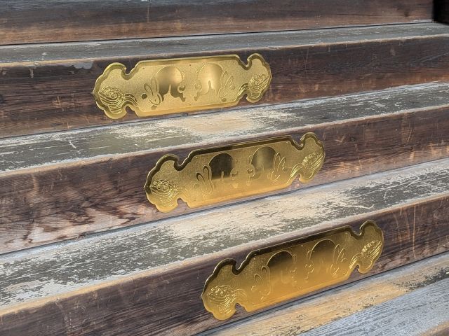 拝殿の階段のゴールドな留め金、ここにもウサギが。