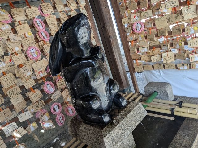 境内の手水舎には黒いウサギ。こちらは子授けうさぎ。黒御影石でできており、水をかけてお腹をこすって祈願すると、子宝に恵まれ安産になるそう。