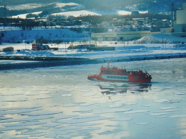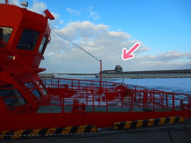 流氷クルーズを終えたガリンコ号IIが帰港する姿も見えます。私の乗船時間が近づいてきたので、そろそろ港へ戻ろう!