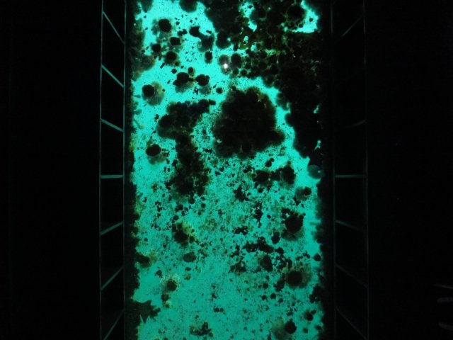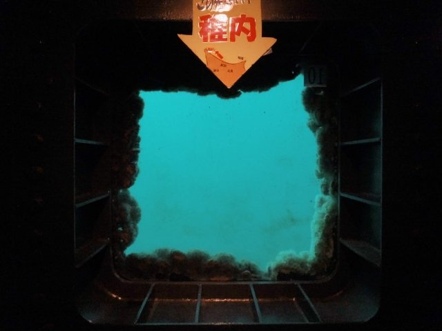 こちらは、あえて掃除してない窓。通常は月に1~2回ほどダイバーが潜って掃除しているそうですが、なんと4年以上もそのままだそう。貝やイソギンチャクがべっとりと貼り付いています。
