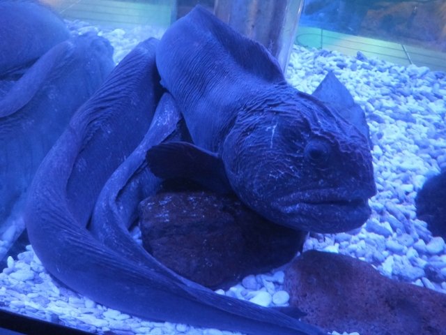 ここで会うことができるのは冷たい海で暮らす生き物たち。するどいキバだけどつぶらな瞳のオオカミウオなど、北国らしいサカナが展示されています。