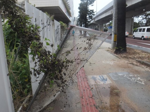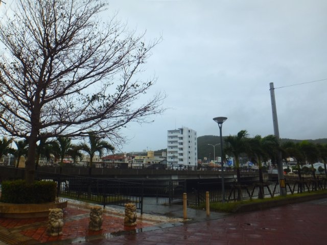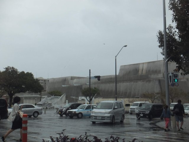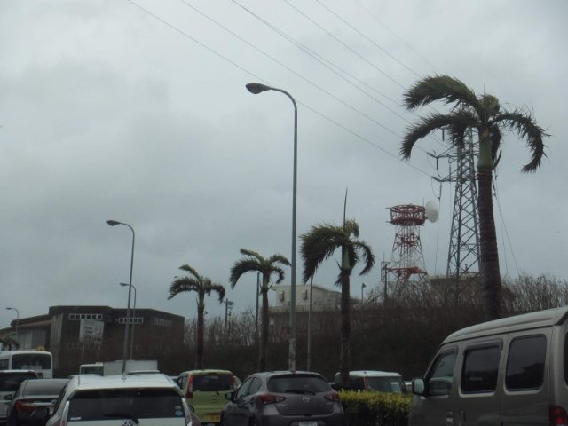 レンタカーを走り出して気がついたのですが、風が物凄くいろいろなものが飛び交っています。そして車はアトラクションのようにガタンガタン揺れます。万が一レンタカーに傷でもついたら大変なので、遠出は控えた方が良さそう。ということで、本日の宿&レンタカー屋さんのある那覇市街地へ向かうことにします。