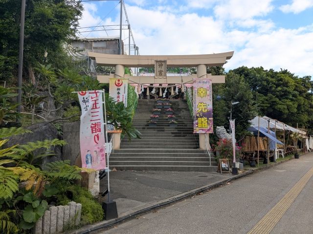 クリーム色の大きな鳥居には、幸先詣の大きな旗が掲げられています。