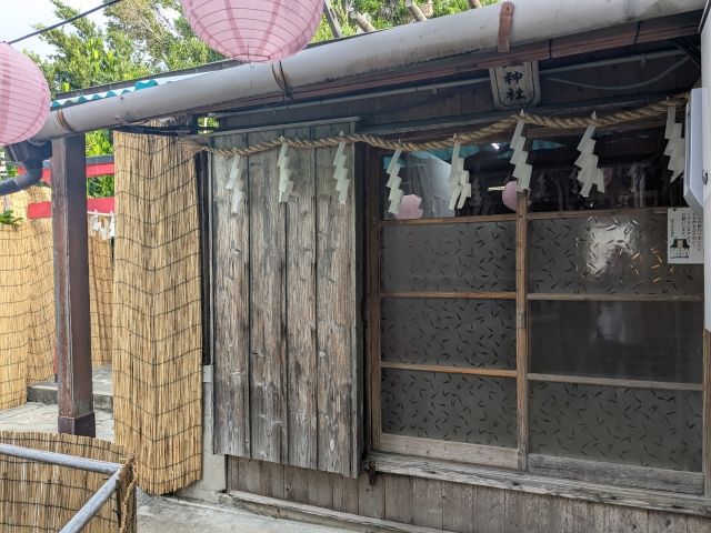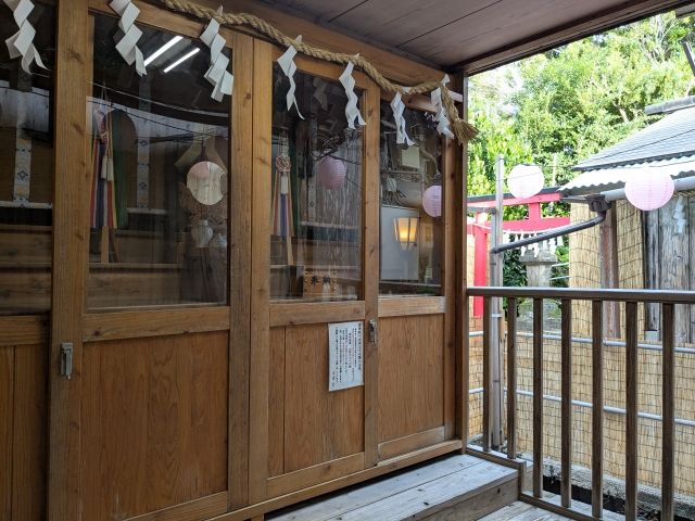 祈祷殿の先にあるのが八坂神社。引き戸を開くと、六畳一間の内部へ。卯・巳・午・未・申・酉・戌・亥の神々を祀っているそうです。