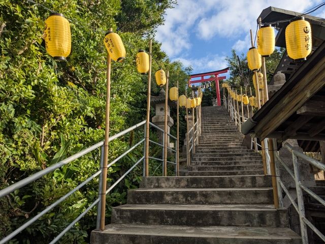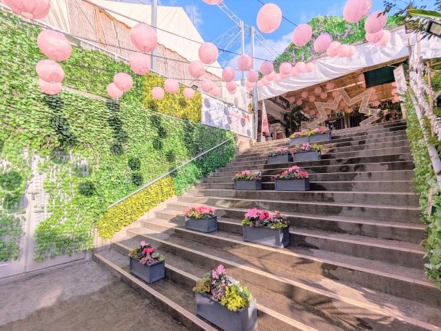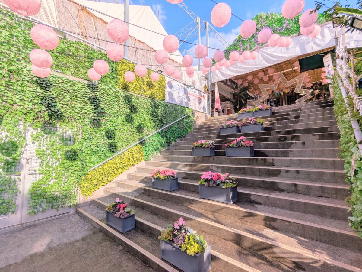 鳥居の先の石段は、プランターが並び、壁面はグリーンカーテン仕様。まるでおしゃれ植物園のようなかわいらしい雰囲気です。