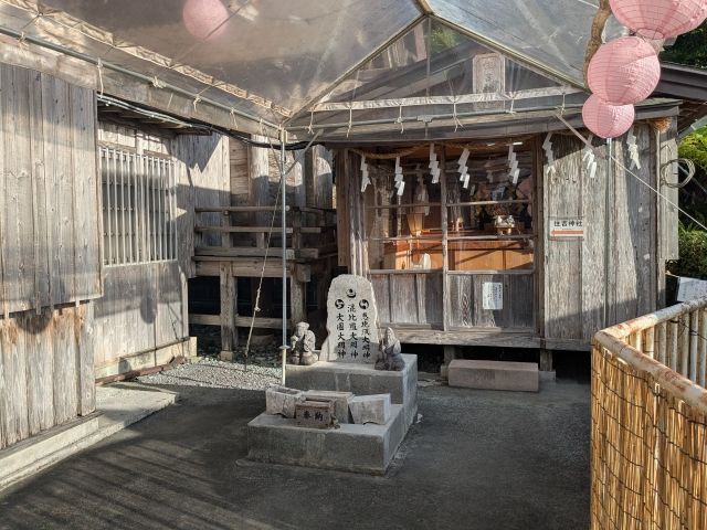 ピンクの提灯に彩られた木造の社殿、内部には御神体の鏡と、えびす様&大黒様の石像が安置されています。隣には仏像や位牌も置かれており、神仏習合の名残を感じる神社です。