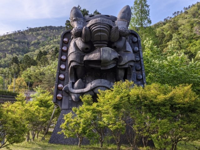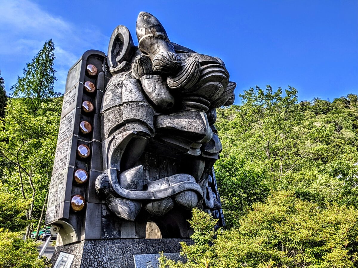 建物の目の間にそびえるのは巨大な鬼瓦。高さは5m、重さは10tにも及び、物凄い形相で訪れる人に睨みをきかせます。こちらは日本鬼師の会が中心となりつくりあげた「大江山平成の大鬼」。130のパーツに分けてつくられているそうです。