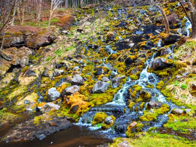 緑や黄色に色づいたコケの岩の間を、まるで縫うように流れていきます。手を入れてみると少しだけ温かい。