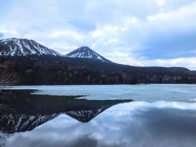 アイヌの言葉で「大きい沼」「年老いた沼」という意味を持つオンネトー。曇っていても美しい湖面はまるで鏡のような輝きを見せ、雌阿寒岳(左)と阿寒富士(右)をくっきりと写しています。
