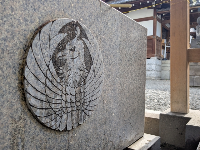 手水鉢に彫り込まれた鳳凰は、少しデフォルメされたかっこいい姿。ちょっぴりウルトラ怪獣感もあります。