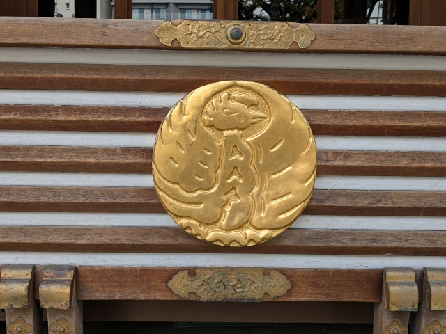 鳥明神として祀られた経緯から、神紋は鳳。賽銭箱にも金色の鳳凰のレリーフが刻まれています。