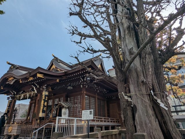 御神木の大イチョウも。武蔵野の名木として知られる樹木であり、昭和5年(1930年)に町民によって境内へと献木されたそう。空襲に見舞われるも復活した奇跡の巨木なのです。