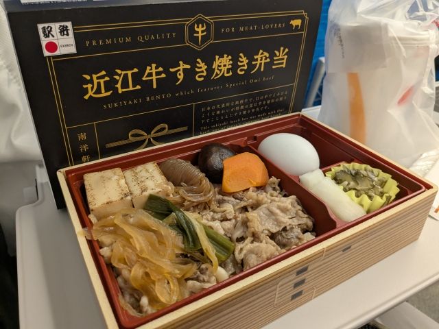 夕ご飯は、新大阪駅で買った近江牛すき焼き弁当。温泉たまごがついててラッキーな気分!万博会場内の海外パビリオンだったら2,500円くらいしそうなので、普通のお弁当がめっちゃ安く感じます。これはきっと万博あるあるですね。