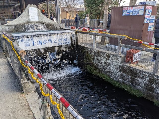 池の傍では、水源である富士山の雪解け水が流れ出しています。勢いよく流れ出る水からは、湧出量の多さを体感できます。
