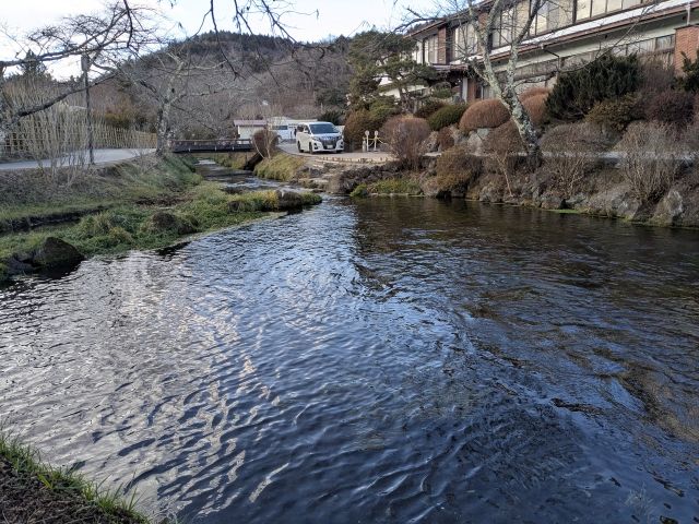 湧池の近くにも大きな池があります。こちらは忍野八海にはカウントされていない中池。売店の個人所有の池であり、テニスコートだった土地を池にしたものであるそう。