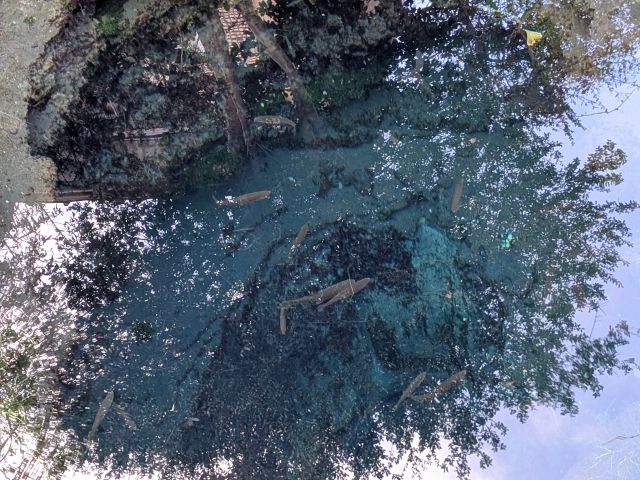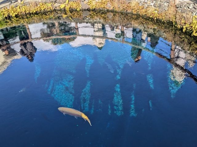 のぞき込むとかなりの深さ。水深は8mもあり、吸い込まれそうなコワさも感じます。ここもまたアルビノニジマスが泳いでいました。
